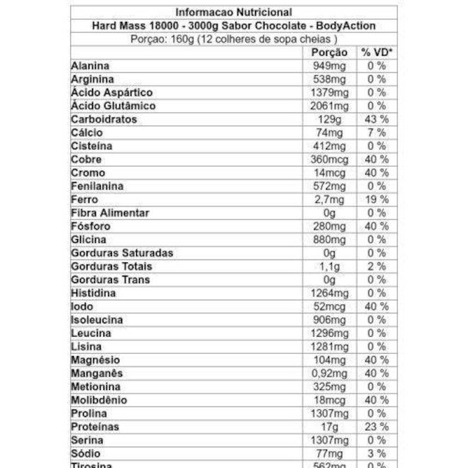 282), Proteína Hidrolisada do Trigo, Cacau em Pó, Albumina Desidratada, Mix de Vitaminas e Minerais, Vitamina A, Palmitato de Retinol, Vitamina B1 mononitrato de Tiamina, Vitamina B2 Riboflavina, Vitamina B3 Nicotinamida, Vitamina B12 Cianocobalamina, Ácido Fólico, Vitamina C Ácido Ascórbico, Vitamina D Colecalciferol, Vitamina E Acetato de Tocoferol, sulfato de Zinco monohidratado, Sulfato de Manganês Monohidratado, Sulfato Cobre Anidro, Molibdato de Sódio Dihidrarado, Picolinato de Cromo, Iodeto de Potássio, Selenito de Sódio, Fluoreto de Sódio Anidro, Fosfato Monocálcico Monohidratado), Aroma idêntico ao Natural de Chocolate.