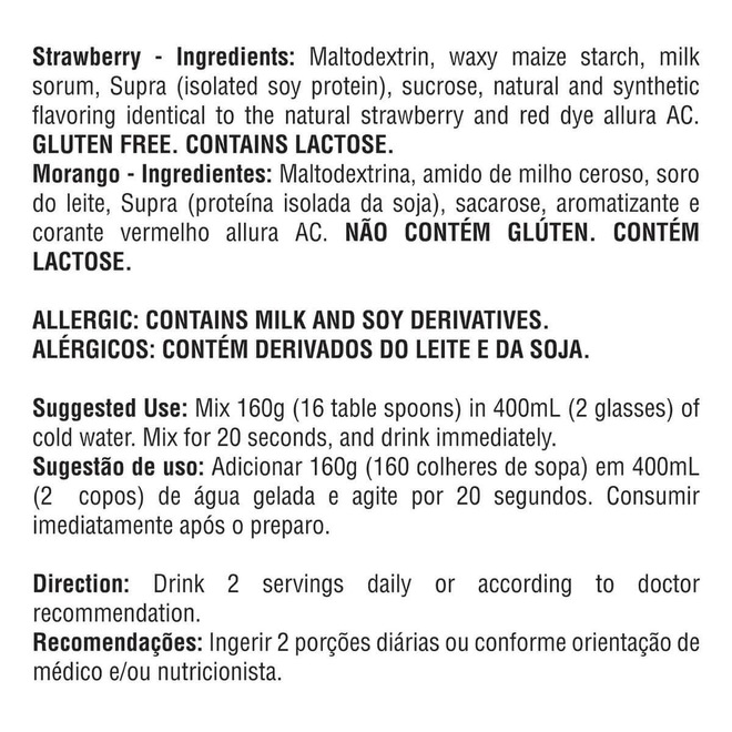 Ingredientes: Maltodextrina, amido de milho ceroso (waxy maize), soro do leite, proteína de soja, sacarose, aromatizante e corante..