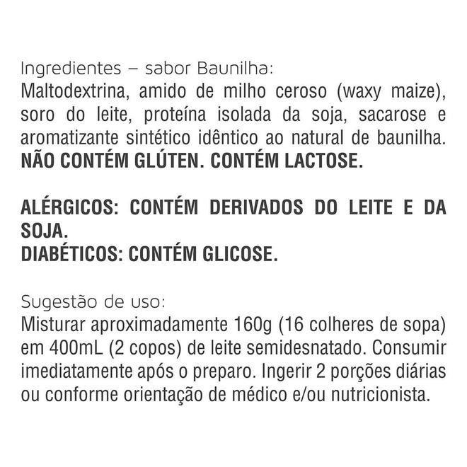 Ingredientes: Maltodextrina, amido de milho ceroso (waxy maize), soro do leite, proteína isolada da soja, sacarose e aromatizante sintético idêntico ao natural..