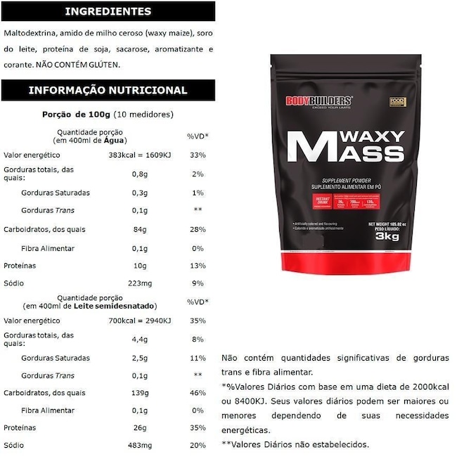 HIPERCALÓRICO WAXY MASS é o que você precisa em uma dieta com alta ingestão de nutrientes de qualidade, que promovem construção muscular e ganho de peso mantendo os níveis de energia constantes. Com 26g de proteínas, 139g de carboidratos e 700Kcal por dose. Indicado para pessoas que têm o metabolismo muito acelerado e querem ganhar peso desenvolvendo massa magra. O hipercalórico foi desenvolvido com os melhores carboidratos de rápida absorção em conjunto com as proteínas do soro do leite e da soja. NÃO CONTÉM GLÚTEN.