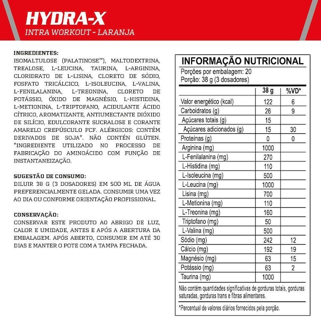 Hydra-X é um intratreino completo, composto por um blend de carboidratos com diferentes velocidades de absorção, ofertando energia de forma gradual e eficiente durante todo o período de treinamento, garantindo a reposição energética. Auxilia no desempenho físico de atividades extenuantes, possui aminoácidos essenciais (EAA) que também estão presentes na fórmula, possuemefeito anticatabólico, atuam na síntese proteica e na geração de energia muscular, os aminoácidos arginina e taurina contribuem para a melhora da resistência muscular.