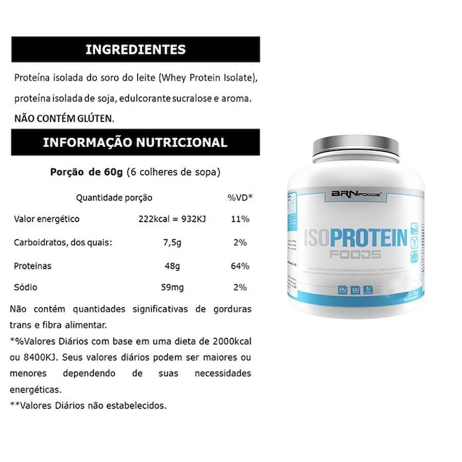 Glú ten: Nã o Conté m | Tipo: Proteí na Isolada | Lactose: Nã o Conté m