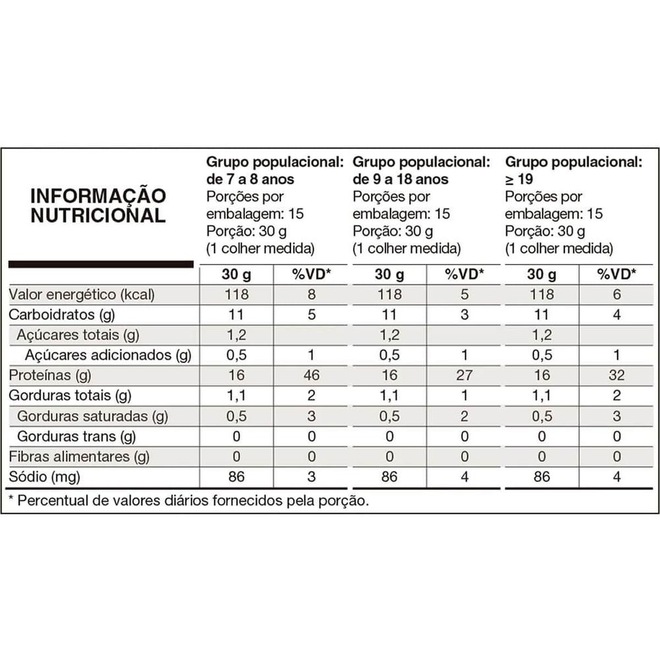Blend proteico [proteína de soro do leite isolada (Whey Protein Isolate - WPI) e proteína de soro do leite concentrada (Whey Protein Concentrate - WPC)], farinha de arroz e lecitina de soja.