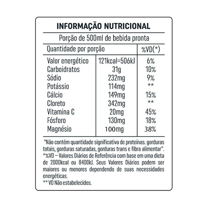 Sacarose, Frutose, Glicose, Ácido Cítrico (Acidulante), Fosfato Tricálcico, Citrato de Sódio (Regulador de Acidez), Cloreto de Sódio, Fosfato de Potássio Monobásico, Acido Ascórbico (Vitamina C), Cloreto de Potássio, Bisglicinato de Magnésio e Aromatizante. NÃO CONTÉM GLÚTEN. DIABÉTICOS: CONTÉM FRUTOSE E GLICOSE.