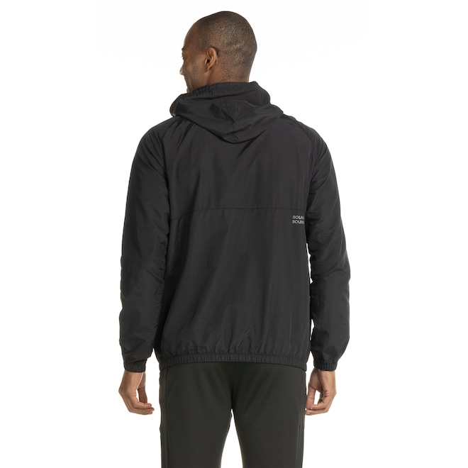 A jaqueta masculina possui fechamento em zíper, dois bolsos laterais para guardar os objetos perto das mãos e capuz com ajuste em cordão.