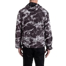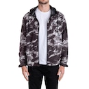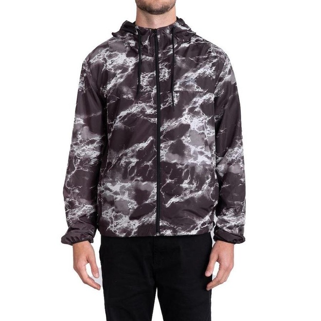 Jaqueta estampada construída em tecido repelente à água, com bolsos embutidos, regulador elástico na barra, estampa no peito e etiquetas personalizadas.
