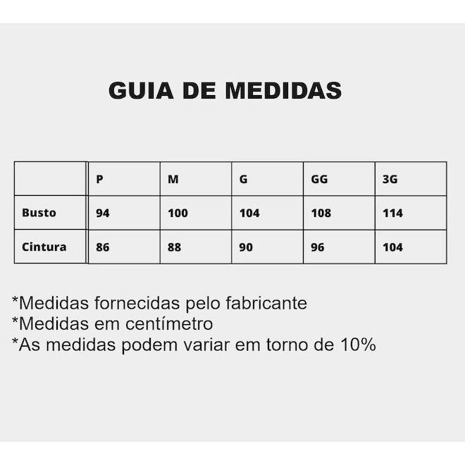 - GG: Circunferência de busto (108 cm), circunferência de cintura (96 cm)