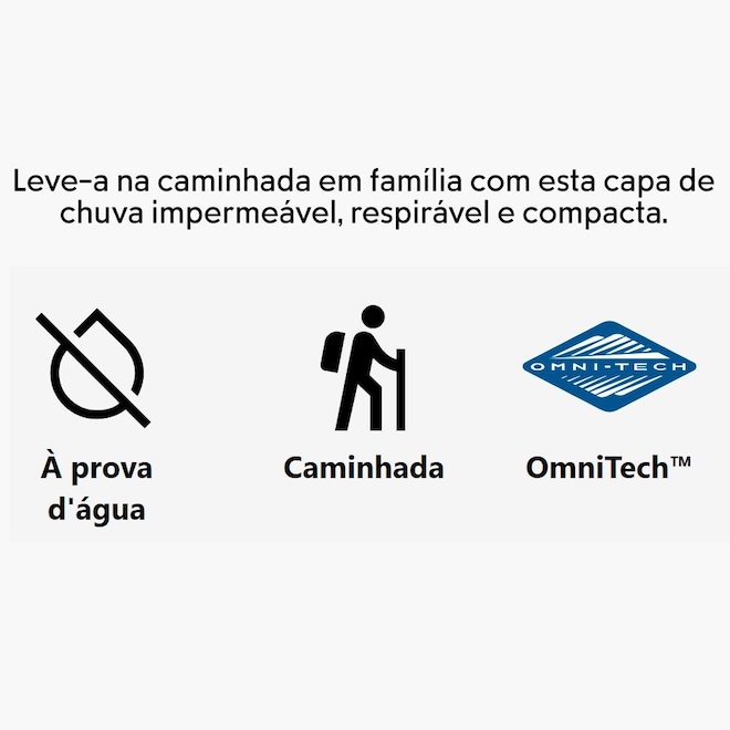 • Omni-Tech? com costura totalmente selada evita que a umidade penetre em todas as costuras usando tecido impermeável e respirável, para que você fique completamente seco na chuva