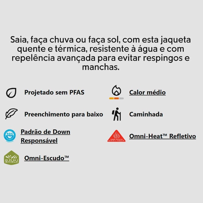 • Material: Corpo: 100% poliéster. Forro: 100% poliéster. Isolamento: Isolamento com plumas: 650 fill, Certificado RDS.;
