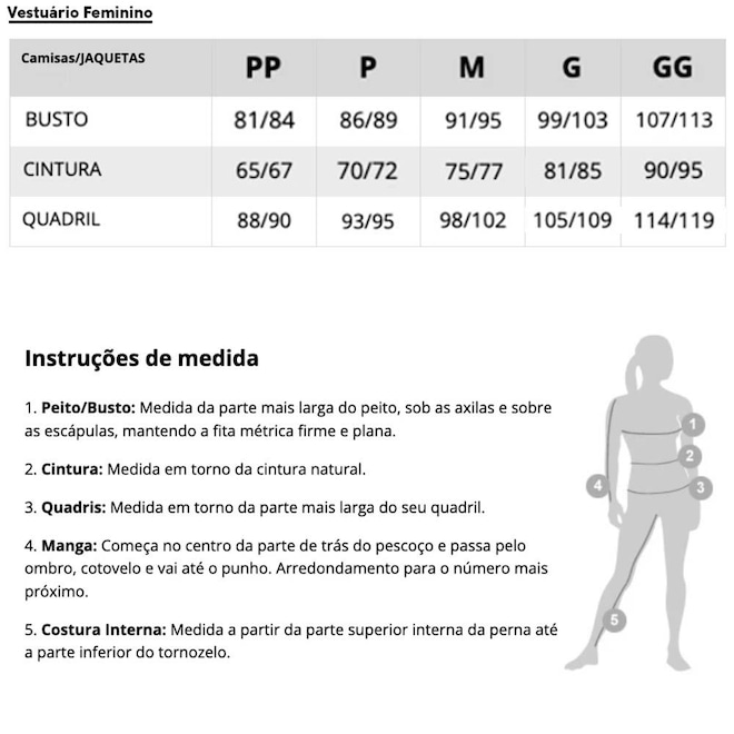 Tamanho | Cintura | Quadril | Peito