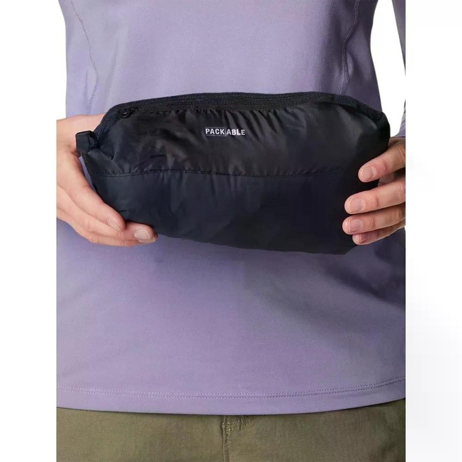 A jaqueta Down feminina com capuz Pebble Peak também possui costuras termo-seladas Heat Seal, resistente à entrada de vento e de água e possui composição leve e respirável, ideal para levar na mala de viagens e mochilas de aventura.