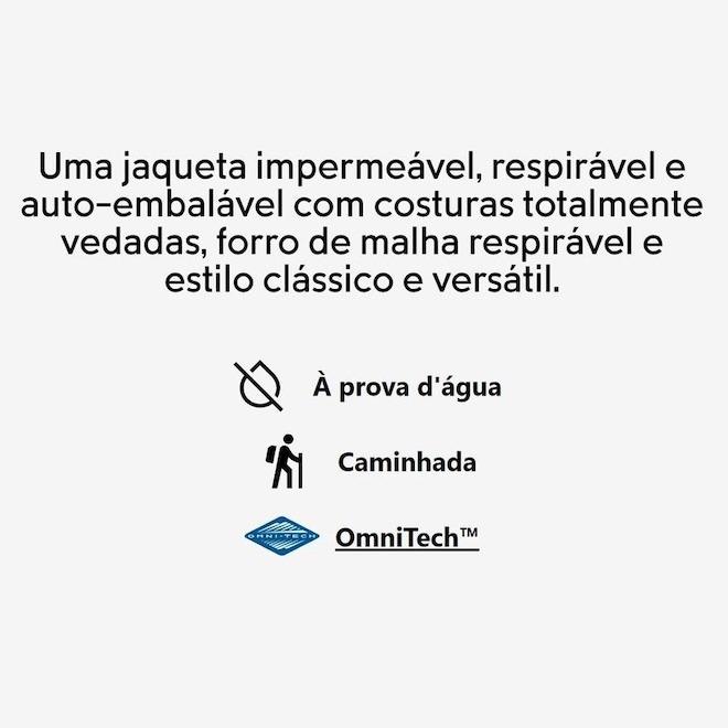 - Omni-Tech? com costura totalmente selada evita que a umidade penetre em todas as costuras usando tecido impermeável e respirável, para que você fique completamente seco na chuva