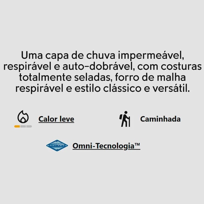 - Material: Corpo em Omni-TECH™ coated 100% poliamida e Forro 100% Poliéster Mesh;