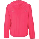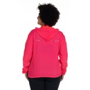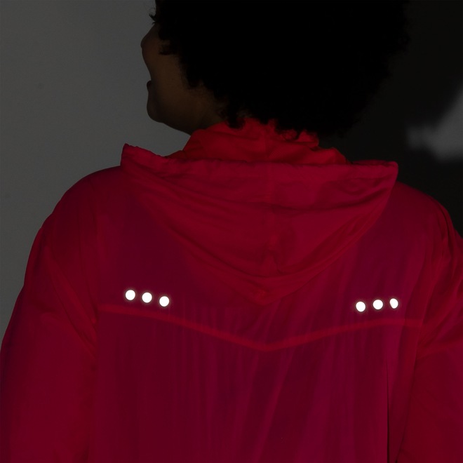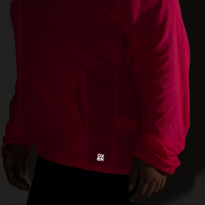 Possui fechamento, dois bolsos frontais para guardar os objetos perto das mãos, o capuz tem ajuste por cordão e detalhes refletivos.