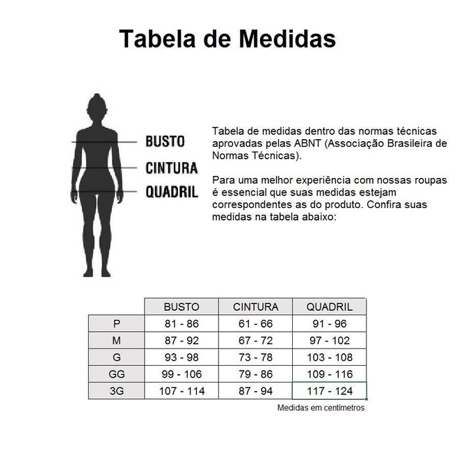 - Tamanho GG: Busto (99 - 106 cm), circunferência de cintura (79 - 86 cm)