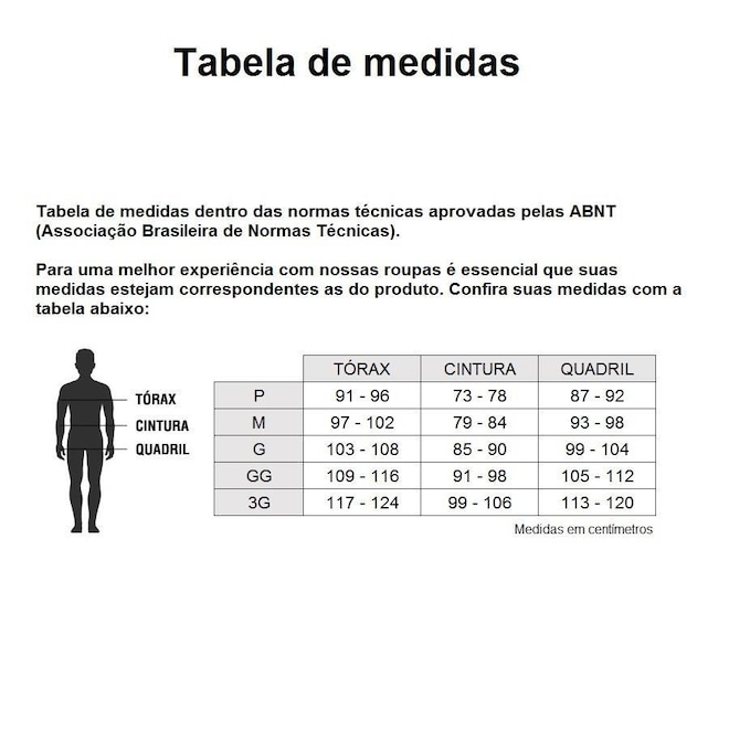 - Tamanho GG: Circunferência de tórax (109 - 116 cm), circunferência de cintura (91 - 98 cm)