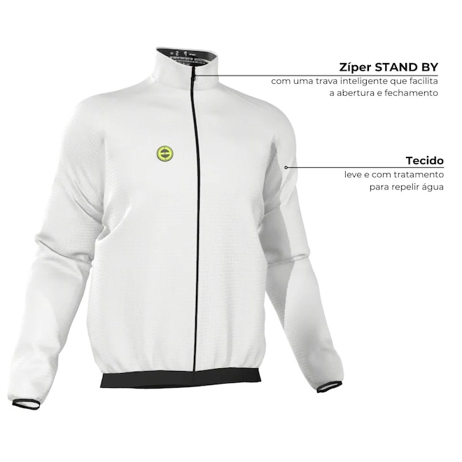 A jaqueta corta vento de ciclismo da ERT trás proteção contra as rajadas de vento que o corpo recebe durante a atividade esportiva e protege o corpo contra chuvas leves, repelindo e escorrendo a água sobre a superfície do tecido. O produto absorve pouca água, seca rapidamente e não ganha peso. Essa repelência de água é obtida com um tratamento aplicado diretamente no fio do tecido, garantindo muito eficacia e um tempo maior de vida útil do tratamento.