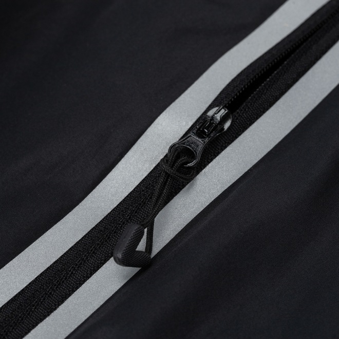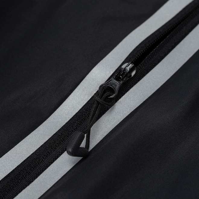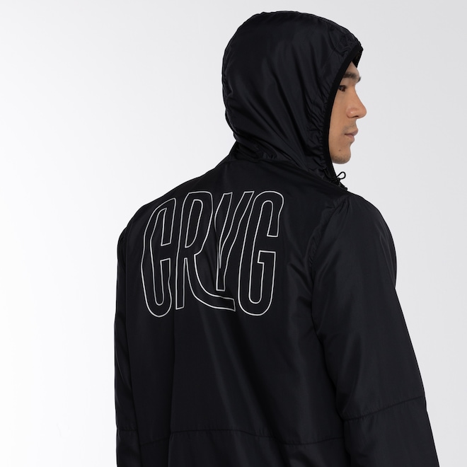 Sua gola é alta, o capuz tem ajuste em cordão e a barra e punhos elásticos.