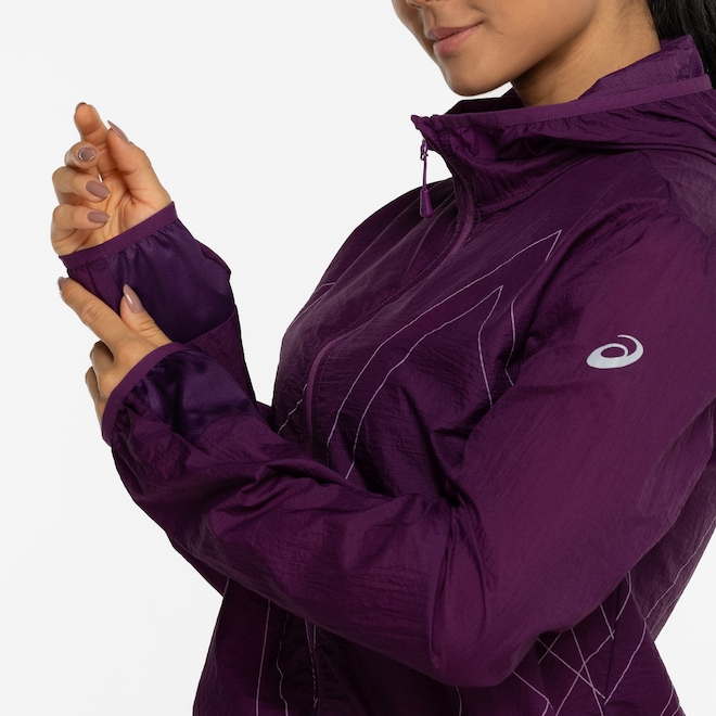 Prepare-se para enfrentar os ventos com estilo com a Jaqueta Corta-Vento Feminina ASICS com Capuz Toyama Estampa Linhas.