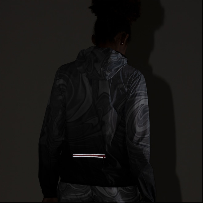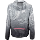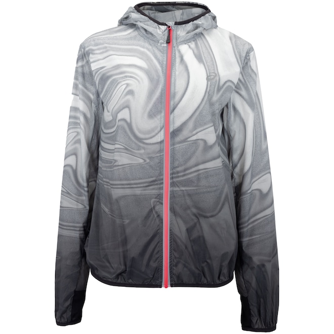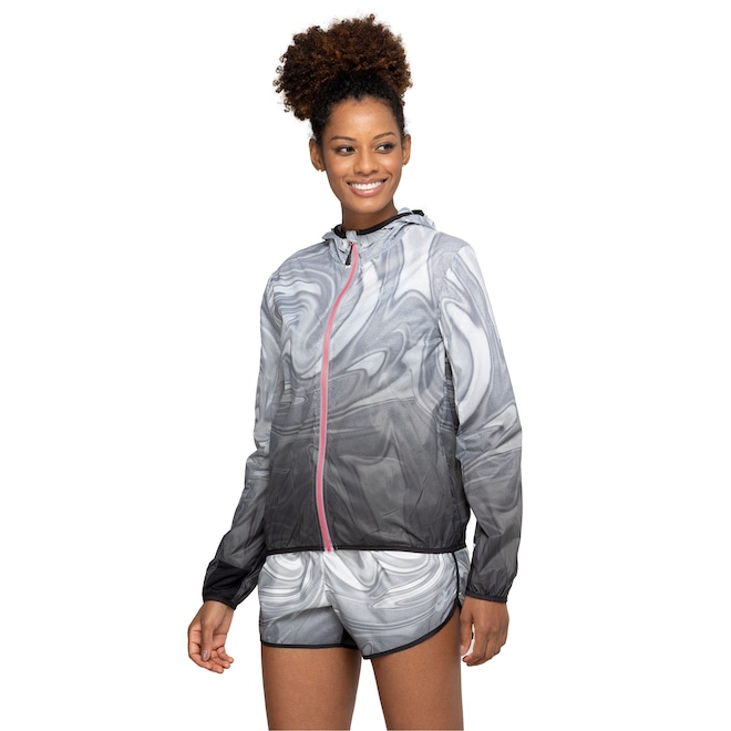 A Jaqueta Toyama Estampa Sumi tem fechamento em zíper, capuz, barra e punhos elásticos, além de ser Packable que significa que ela se dobra em si mesma.
