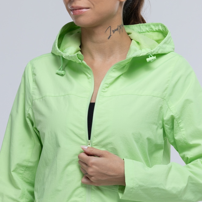 O capuz ajustável com elástico oferece proteção extra contra o vento, enquanto a barra também possui ajuste por elástico para um caimento personalizado e confortável.
