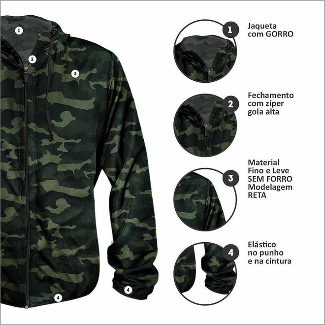 Jaqueta Camuflada Corta Vento Masculino WSS é a sua aliada no dia a dia! O tecido leve fornece conforto e te mantém aquecido em dias de frio, ideal para praticas de esportes e atividades ao ar livre, a opção perfeita para complementar o visual de maneira irreverente. Contém capuz com cordinha para melhor ajuste, dois bolsos, elástico na cintura e pulso, sem forro.
