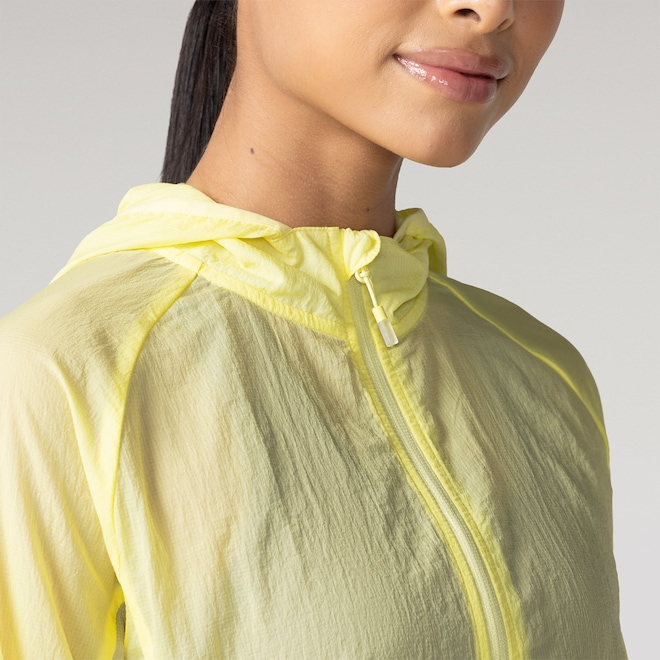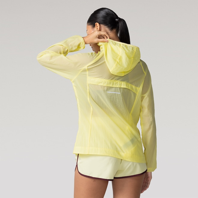 Ajuste Frontal por ZíperPunho Punhos Elásticos Capuz Barra Elástica Detalhes Refletivos Refletivo: Possui propriedades refletivas que aumentam a visibilidade para maior segurança aos atletas que praticam esportes em locais com pouca iluminação. Modelagem Packable: Prática (o), pode ser armazenada ao ser dobrado(a) no próprio bolso