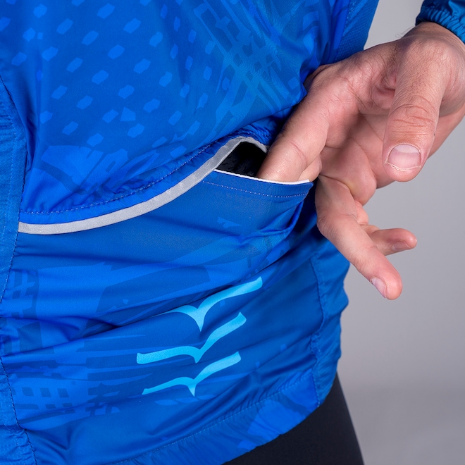 Possui 2 bolsos frontais fechados com zíper, para transportar com segurança pertences essenciais, além de poder, dobrar a peça pelo bolso e armazenar a jaqueta dentro dele, podendo ser guardado no bolso de sua camisa de ciclismo.
