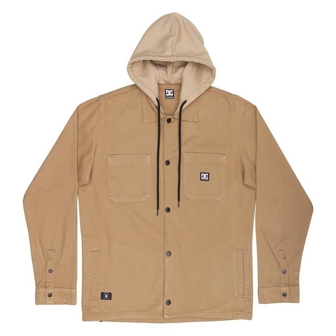 Jaqueta DC Shoes do tipo parka, sarja de algodão tinturada, gola de camisa, fechamento com botões de pressão, capuz de moletom com cordão de ajuste, recorte na parte superior das costas, bolso do lado esquerdo do peito, bolsos embutidos nas laterais, punho de camisa com fechamento com botões de pressão e etiqueta personalizada aplicada no bolso do peito.