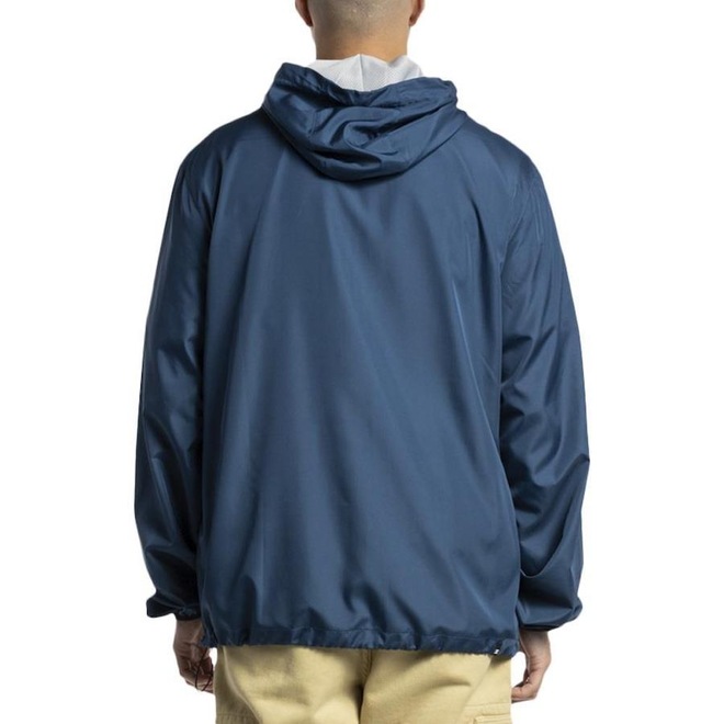 Jaqueta Windbreaker com tecido de nylon leve resistente à água, recorte no capuz, forro do capuz em mesh contrastante, bolsos embutidos, estampa refletiva no peito, viés de elástico no punho, elástico com reguladores plásticos no capuz e na barra.