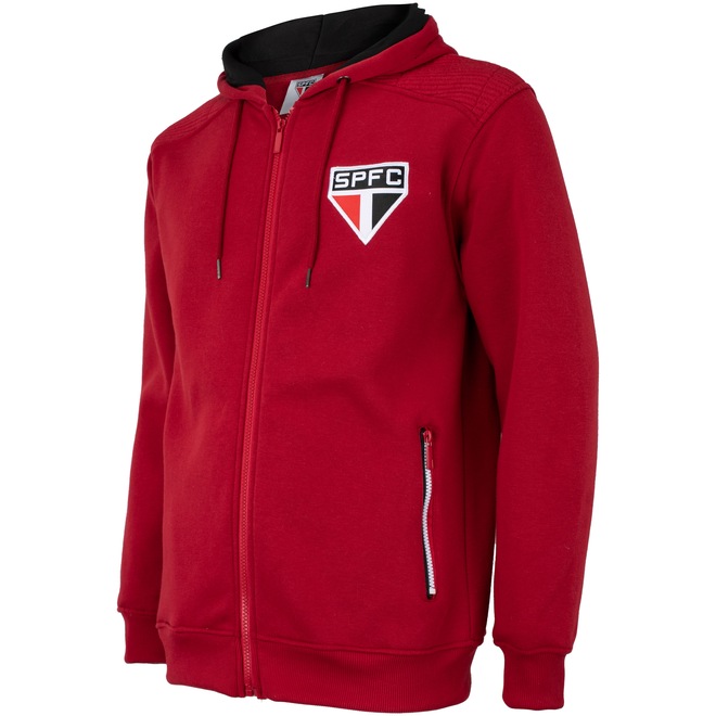 A jaqueta de moletom do São Paulo possui capuz com ajuste por cordão, dois bolsos laterais com fechamento em zíper para guardar seus objetos perto das mãos e forro flanelado.