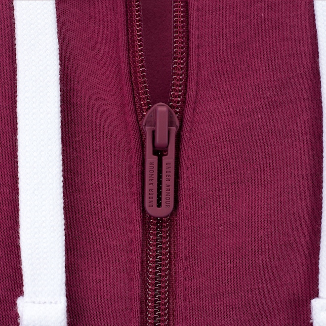 A Jaqueta de Moletom Under Armour apresenta barra e punhos canelados, fechamento em zíper, gola alta e capuz integrado e ajustado por cordão.