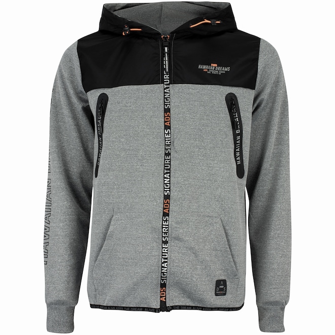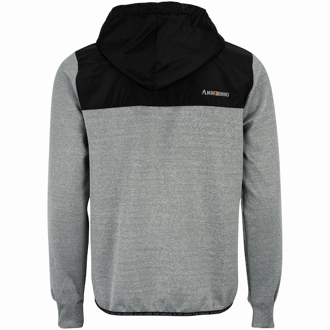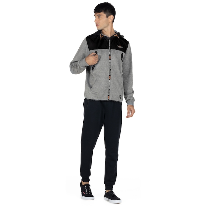 A jaqueta de moletom masculina é de gola alta, com fechamento por zíper.