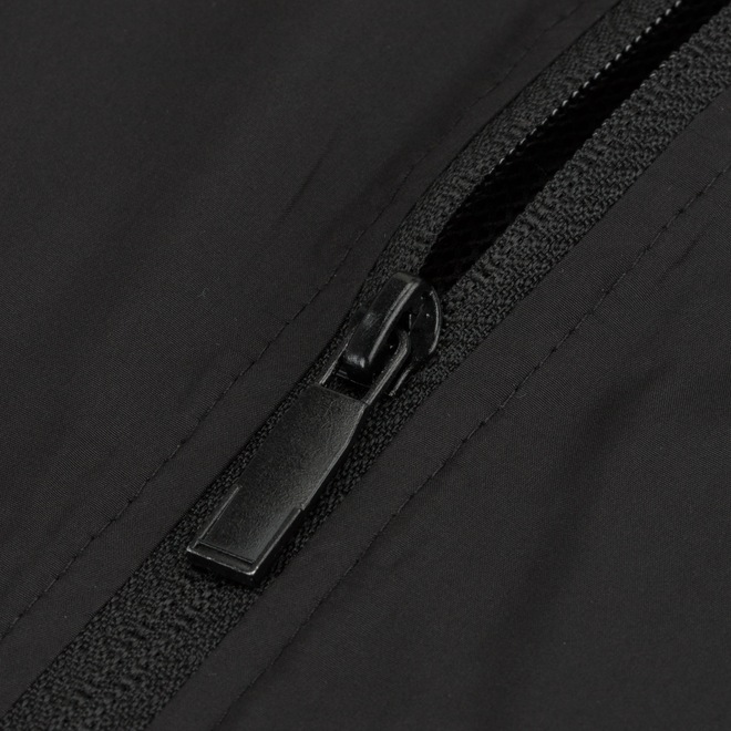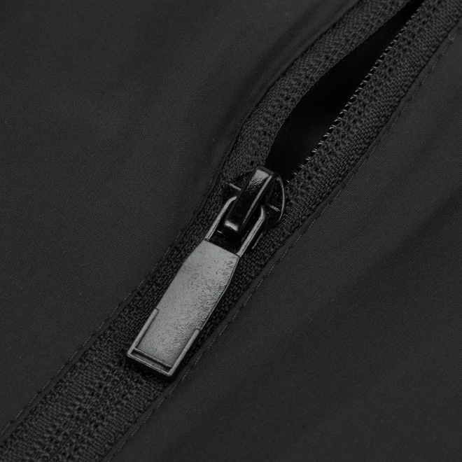 O seu capuz tem ajuste por cordão, há dois bolsos laterais com fechamento em zíper para guardar o essencial perto das mãos e sua gola é alta.