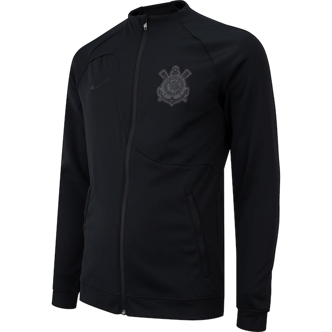 A jaqueta do Corinthians masculina é de gola alta, com modelagem slim fit.