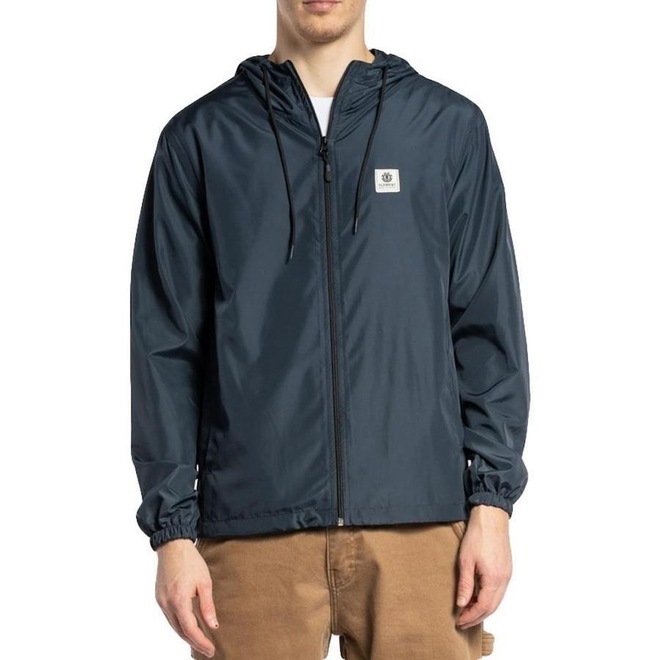 Jaqueta Windbreaker com capuz e cordão para ajuste, ajustadores embutidos na barra, zíper com puxador personalizado, bolsos embutidos, patch frontal, repelente à água e etiquetas personalizadas Element.