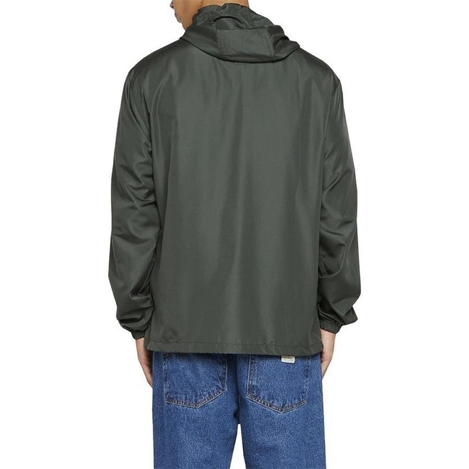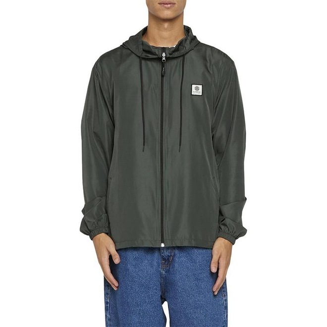 Jaqueta Element windbreak com capuz e cordão para ajuste, ajustadores embutidos na barra, zíper com puxador personalizado, bolsos embutidos, patch frontal, repelente a água e etiquetas personalizadas.