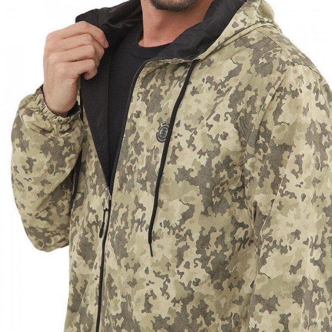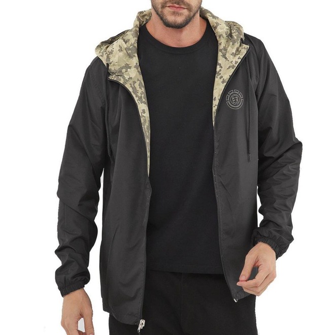 Jaqueta corta-vento, dupla face, um lado estampado de camuflado exclusivo Element, do outro preto, ambos com estampa no peito esquerdo de quem veste, bolsos laterais e etiquetas personalizadas Element.