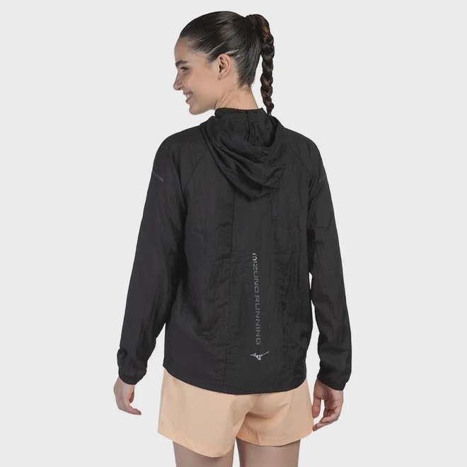 Jaqueta em tecido plano leve de poliamida com ventilação nas costas e recortes geométricos. Detalhes refletivos frente e costas. Costura flatlock com fita refletiva. Bolsos frontais c/ zíper invertido. Ajustadores no capuz. Logo refletivo. Estampa temática nas costas.