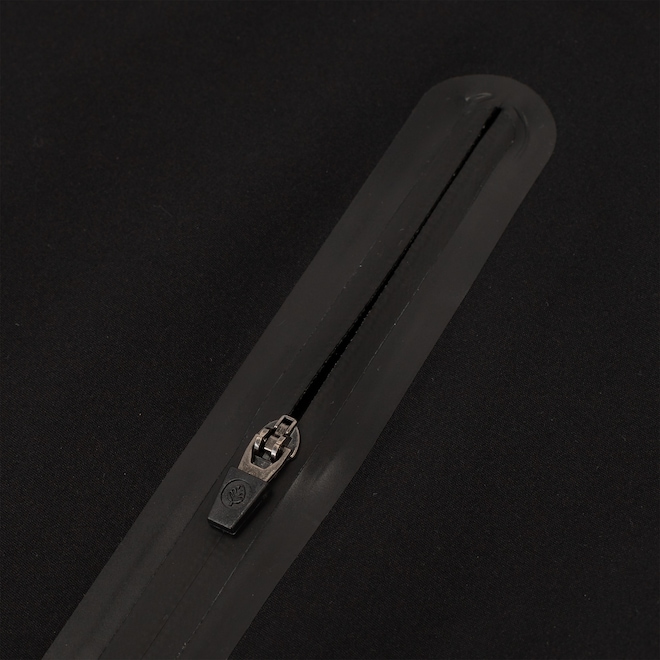 Sua costura é selada, tem bolso interno e o zíper do fechamento é personalizado.