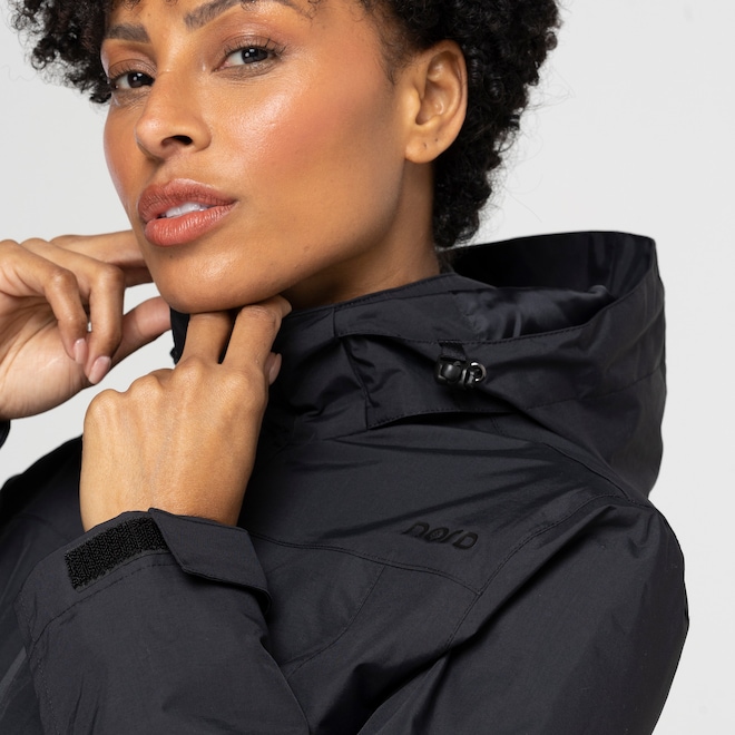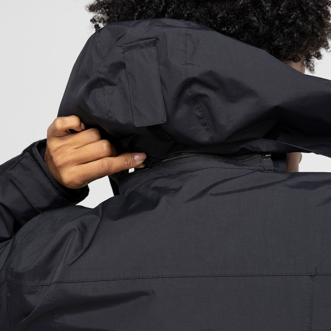 O capuz tem ajuste por cordão e é removível por fita de velcro e zíper.