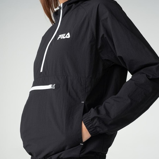 Jaqueta feminina confeccionada em tecido Ripstop de poliamida com forro em Mesh respirável. Modelagem anorak com capuz e manga longa raglan. Seu tecido possui a tecnologia FLOW, que proporciona rápida secagem, mantendo o corpo na temperatura ideal para a prática esportiva. Possui abertura frontal em meio zíper contrastante com puxador personalizado, bolsos laterais, bolso frontal com zíper contrastante, capuz com ajuste de elástico personalizado, punhos e barras com elástico franzido e logo Fila Letter aplicado na parte frontal esquerda superior.ref: M0ZWCZ