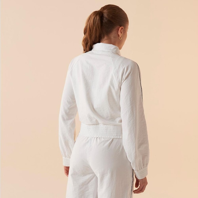 Jaqueta feminina confeccionada em tecido plano de poliéster com poliamida. Na modelagem cropped, conta com gola alta e mangas raglan. Detalhes como vivos contrastantes em poliéster reciclado e abertura frontal em zíper reforçam a identidade esportiva. A barra e os punhos com elástico garantem o ajuste ideal. O bordado F-Box no peito adiciona autenticidade ao visual.