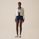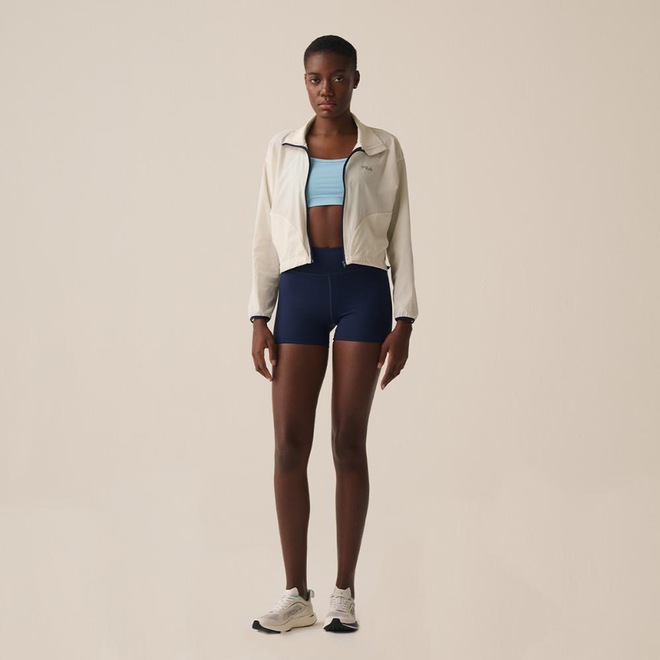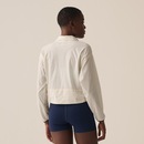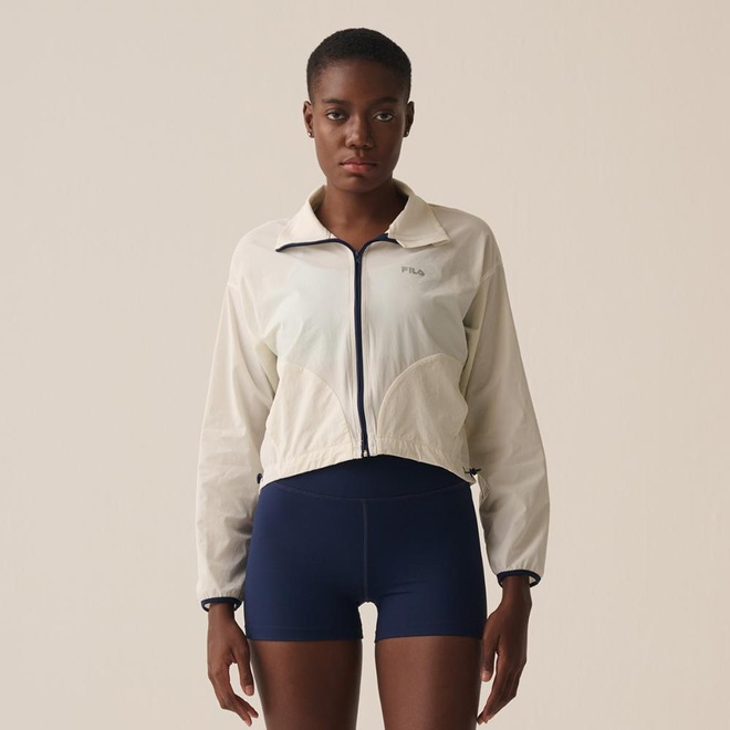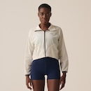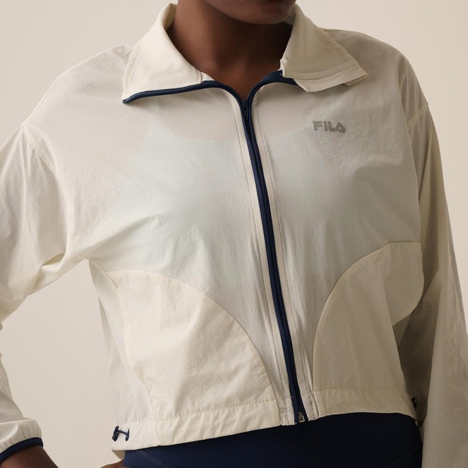 Jaqueta feminina em tecido plano de poliamida com elastano, indicada para treinos de baixa e média intensidade. Modelagem box, solta no corpo, com comprimento cropped, gola alta e manga longa. Seu tecido contém as tecnologias FLOW e proteção solar FPS 50+. Possui abertura frontal em zíper com proteção na gola, costuras laterais deslocadas para frente, bolsos laterais acompanhando as costuras deslocadas para frente, barra regulável com elástico e stopper nos recortes laterais.