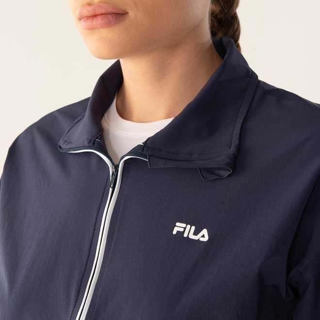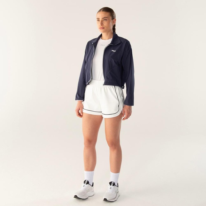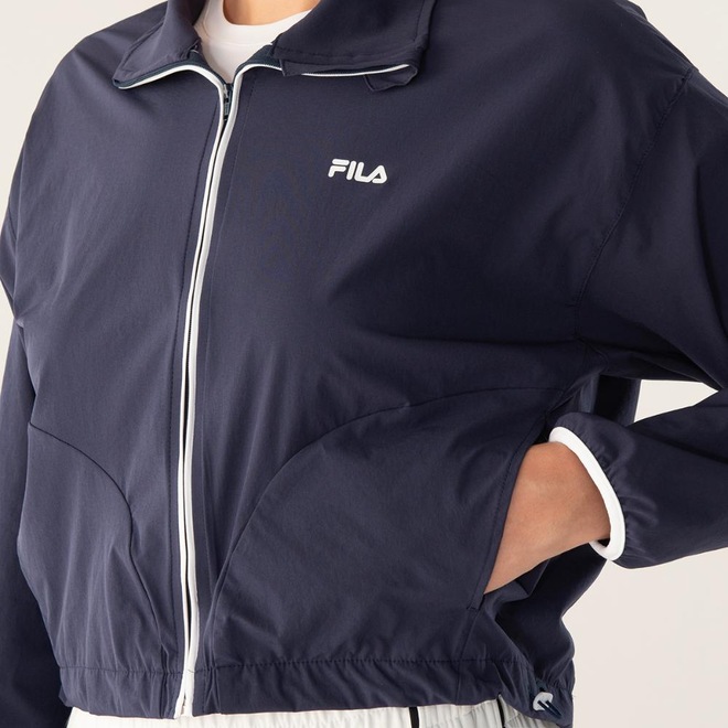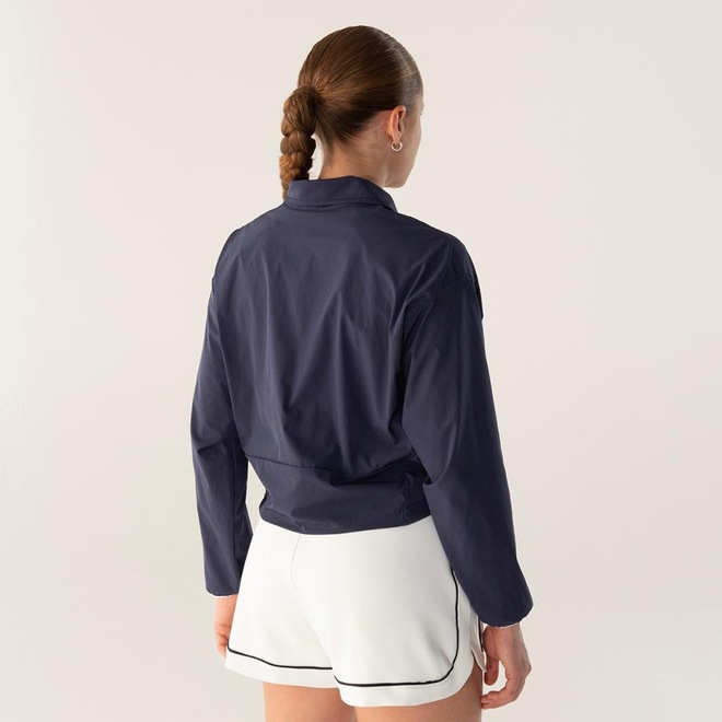 Jaqueta feminina em tecido plano de poliamida com elastano, indicada para treinos de baixa e média intensidade. Modelagem box, solta no corpo, com comprimento cropped, gola alta e manga longa. Seu tecido contém as tecnologias FLOW e proteção solar FPS 50+. Possui abertura frontal em zíper com proteção na gola, costuras laterais deslocadas para frente, bolsos laterais acompanhando as costuras deslocadas para frente, barra regulável com elástico e stopper nos recortes laterais.