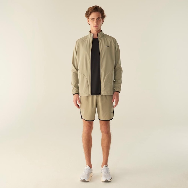 Jaqueta masculina confeccionada em tecido plano 100% poliéster, indicada para treinos de média e baixa intensidade. Modelagem regular com manga longa raglan e gola alta. Possui abertura frontal em zíper com puxador personalizado e acabamento de vivo na vista, bolsos laterais com recorte arredondado acompanhando a costura lateral deslocada para frente, punhos de 1 cm em viés de malha de poliéster, barra traseira com comprimento maior que a barra frontal.