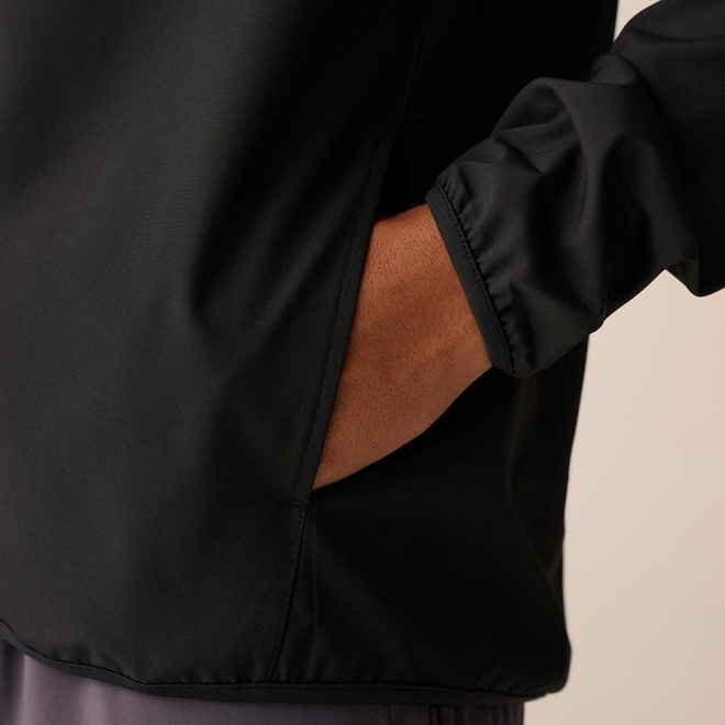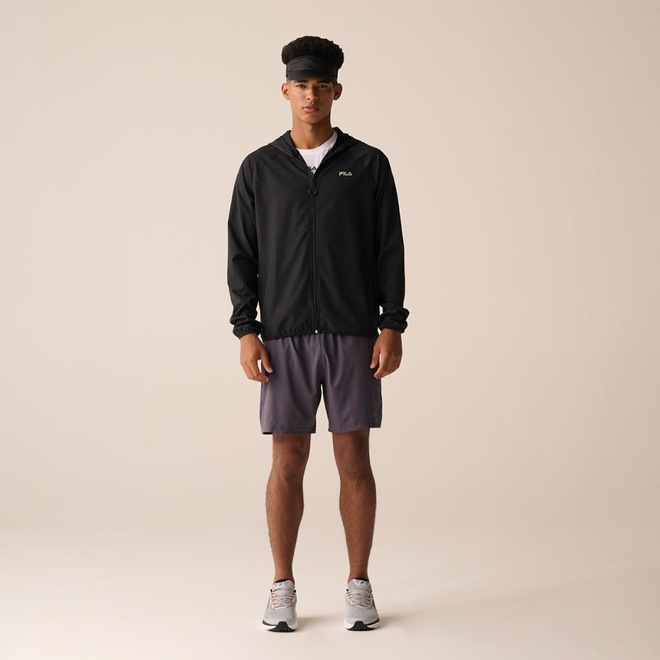 Jaqueta masculina confeccionada em tecido plano misto de poliéster com elastano, indicada para treinos de média e baixa intensidade. Modelagem regular com capuz e manga longa raglan pespontada. O capuz traz elástico rolete interno com stopper para ajuste, ilhós fusionado, recorte anatômico com costura rebatida e forro em tecido telado. Possui abertura frontal em zíper com puxador personalizado, bolsos laterais que acompanham a costura lateral deslocada para frente, barra e punhos em viés de malha de poliéster, barra traseira com comprimento maior que a barra frontal e logo Fila Letter aplicado na parte frontal esquerda superior.