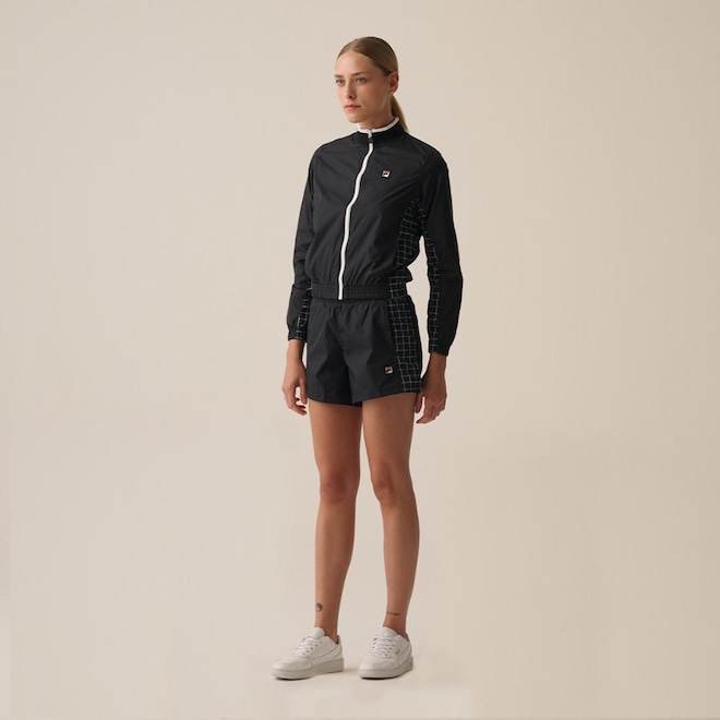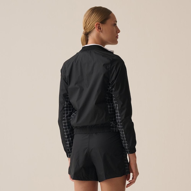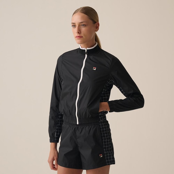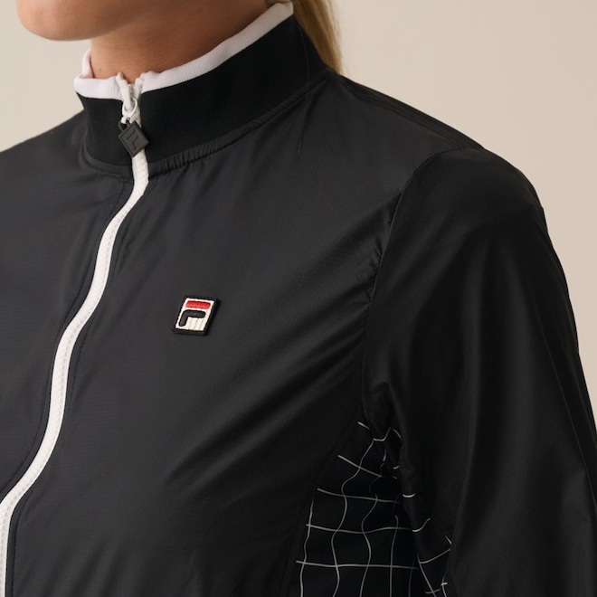 Jaqueta Settanta feminina confeccionada em tecido plano de nylon 100% poliamida, com recortes em 100% poliéster. Modelagem regular com comprimento na altura do cós, gola alta em retilínea e manga longa. Seu tecido contém as tecnologias FLOW, que oferece secagem rápida e respirabilidade, e a UV PROTECTION, que fornece proteção solar FPS 50+ dos raios UVA e UVB. Possui abertura frontal em zíper com puxador F-Box, bolsos laterais, recortes laterais e na parte interna das mangas com estampa sublimada que remete a uma rede de tennis, punhos e barra tombados com elástico interno e patch F-Box aplicado na parte frontal esquerda superior.ref: M17M1Q