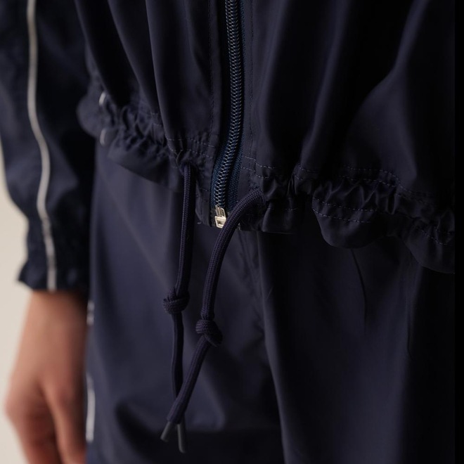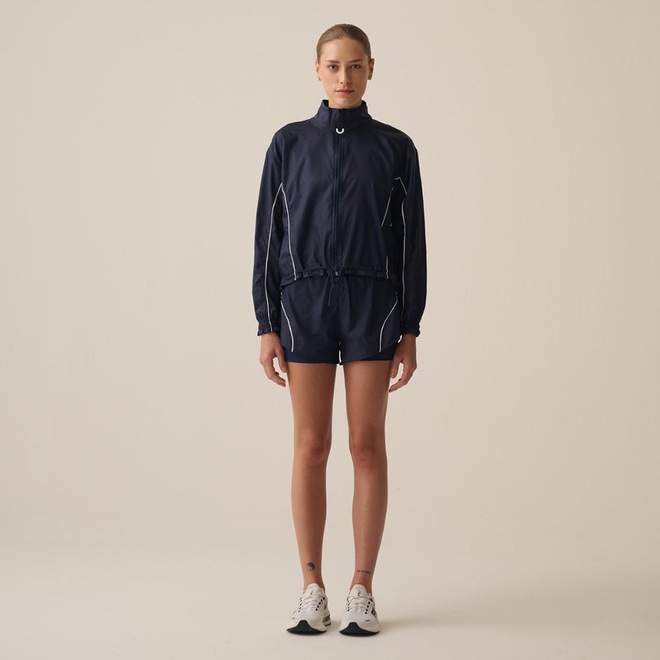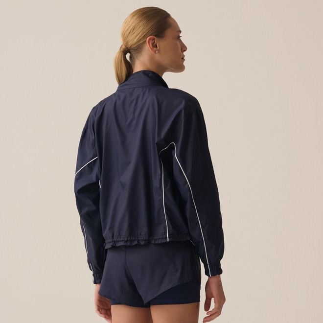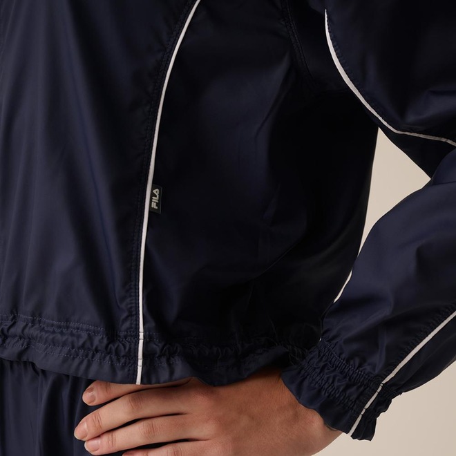 Jaqueta feminina em tecido translúcido de poliamida, repelente à água e com tecnologia FLOW para secagem rápida e conforto térmico. Modelagem comfort, gola alta, zíper frontal com capa protetora, vivos contrastantes, punhos e barra franzidos com elástico e cordão de ajuste. Detalhes incluem costura rebatida e etiqueta bandeira FILA na parte frontal esquerda, unindo estilo e funcionalidade.