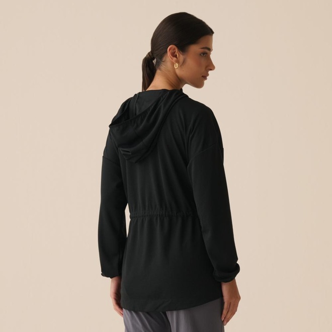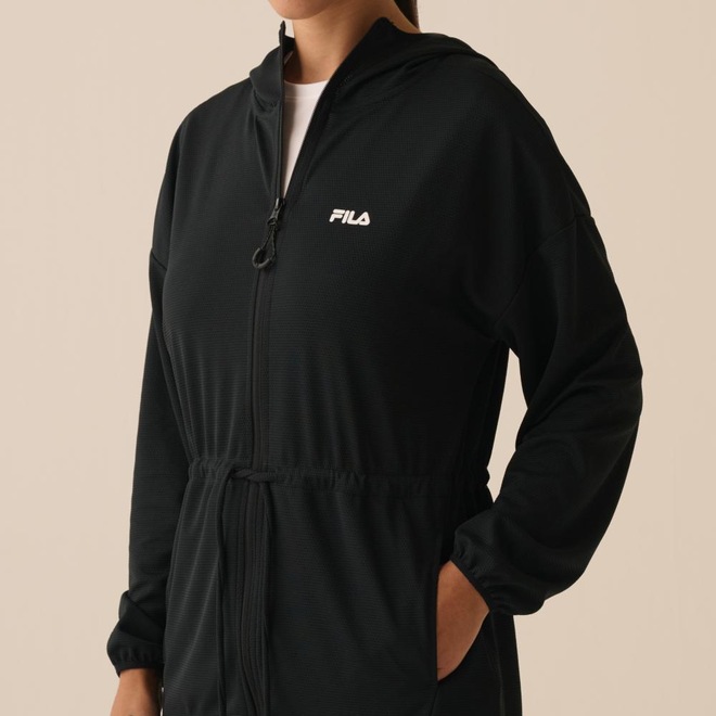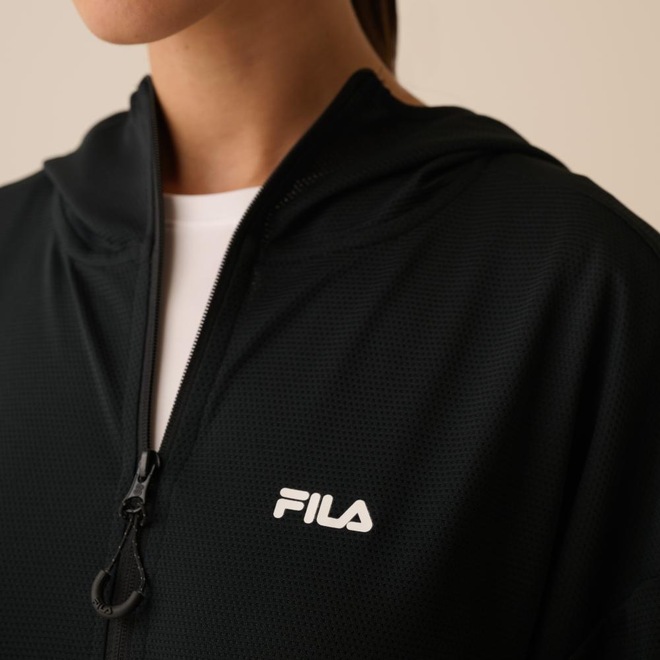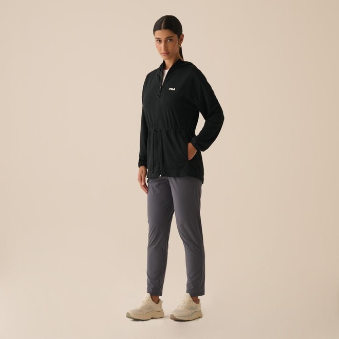 Jaqueta feminina confeccionada em malha texturizada de poliéster e tecnologia Flow, que proporciona mais respirabilidade. É ideal para uso em atividades de baixa intensidade ou também para compor looks após atividades esportivas. Possui capuz, bolsos frontais e recortes anatômicos, além de zíper frontal com puxador personalizado. Exibe FILA Letter aplicado no peito esquerdo da peça.